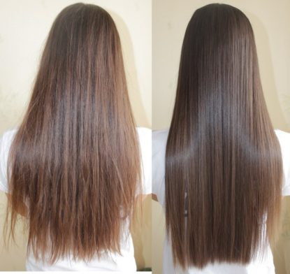 Перед началом выпрямления волосы тщательно промываются специальным шампунем, который открывает чешуйки на поверхности волос. За счет этого молекулы кератина проникают глубоко внутрь их структуры. Затем волосы разделяют на тонкие прядки, и, отступая небольшое расстояние от корней, на каждую из них наносят средство с высоким содержанием кератина.